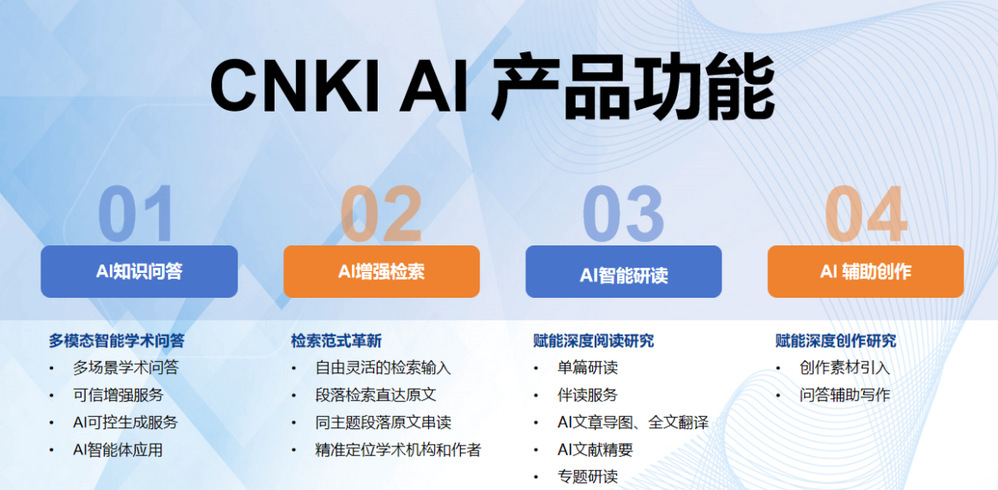 数据库简介:CNKI AI依托知网底层学术资源及先进人工智能技术,将知网高质量数据与产学研用各层面的学术研究场景深度融合,将大模型的自然语言处理、语义理解和内容生成能力融合于科研服务过程中,打造“问-查-读-创”全链条学术研究生态。提供专业化、体系化和场景化的生成式知识服务,解决传统科研场景效率瓶颈,全方位服务科学研究,助力教育科研、工作学习的模式革新和智能升级。