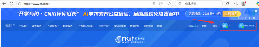 在学校IP范围内进入中国知网(网址https://www.cnki.net/),同步登录个人账号,登录成功后,右上方显示学校名称“云南工商学院”和个人账号名,则为登录成功。
